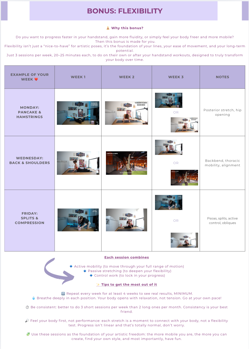 The Get Your Artistic Handstand in One Month program is designed for those who are starting with no experience, but also for those who already have some basics and are stuck.